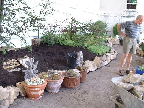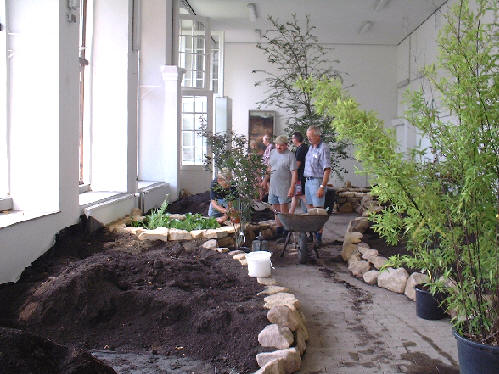 Eine aufwendige Arbeit war das Verstecken der Töpfe im Substrat, damit die Besucher den Eindruck einer normalen Pflanzung erhielten.