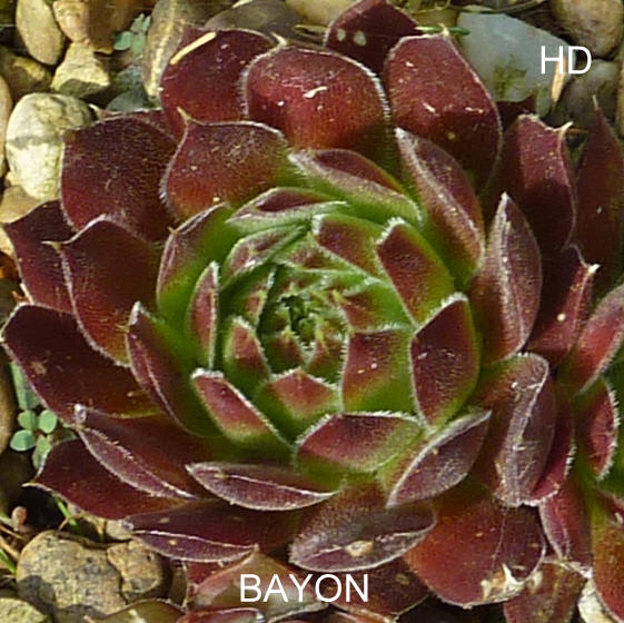 heuffelii) Erwin Geiger: Cornelis Versteeg hat viele Züchtungen mit S. heuffelii und S. globiferum geschaffen. Die angebotene Hybride ist eine Auslese von Sämlingen einer Kreuzung zwischen S. globiferum ssp. allionii mit S. heuffelii; Somit eine S. x kwediana Hybride, die mittlerweile botanisch zu S. nixonii gestellt wird. cv. Bayon formt attraktive, sternförmige Rosetten mit samtigen Blättern, die noch im September glühend rot leuchten!