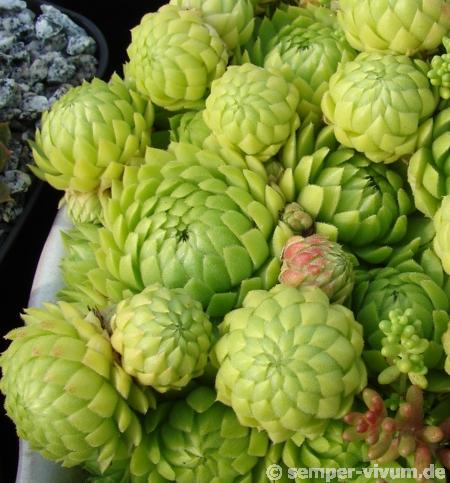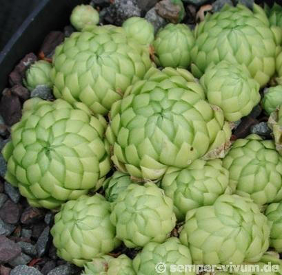 't Hart & Bleij, Name allionii : gewidmet dem Botaniker C. Allioni (1728-1804), Verfasser von der 'Flora Pedemontana' IK: Sempervivum globiferum subsp. allionii (Jord. & Fourr.) 't Hart & Bleij, Nieuwe namen in Sempervivum sect. Jovibarba (New combinations in the genus Sempervivum sect. Jovibarba), in Succulenta 78(1): 40 (1999) Jovibarba allionii / gültige Nomenklatur: Sempervivum globiferum ssp. allioniiBeschreibung: SW-Alpen von Frankreich bis Südtirol. Bildet dicht gefügte, flache, feste Matten aus gleichmäßig großen, bleichgrünen bis fast gelben, glänzenden Rosetten. Rosettengröße bis 2,5cm, geschlossen, fast kugelig. Blätter fein drüsig behaart. Blüten 6-strahlig, gelblich, jedoch ein fauler Blüher.