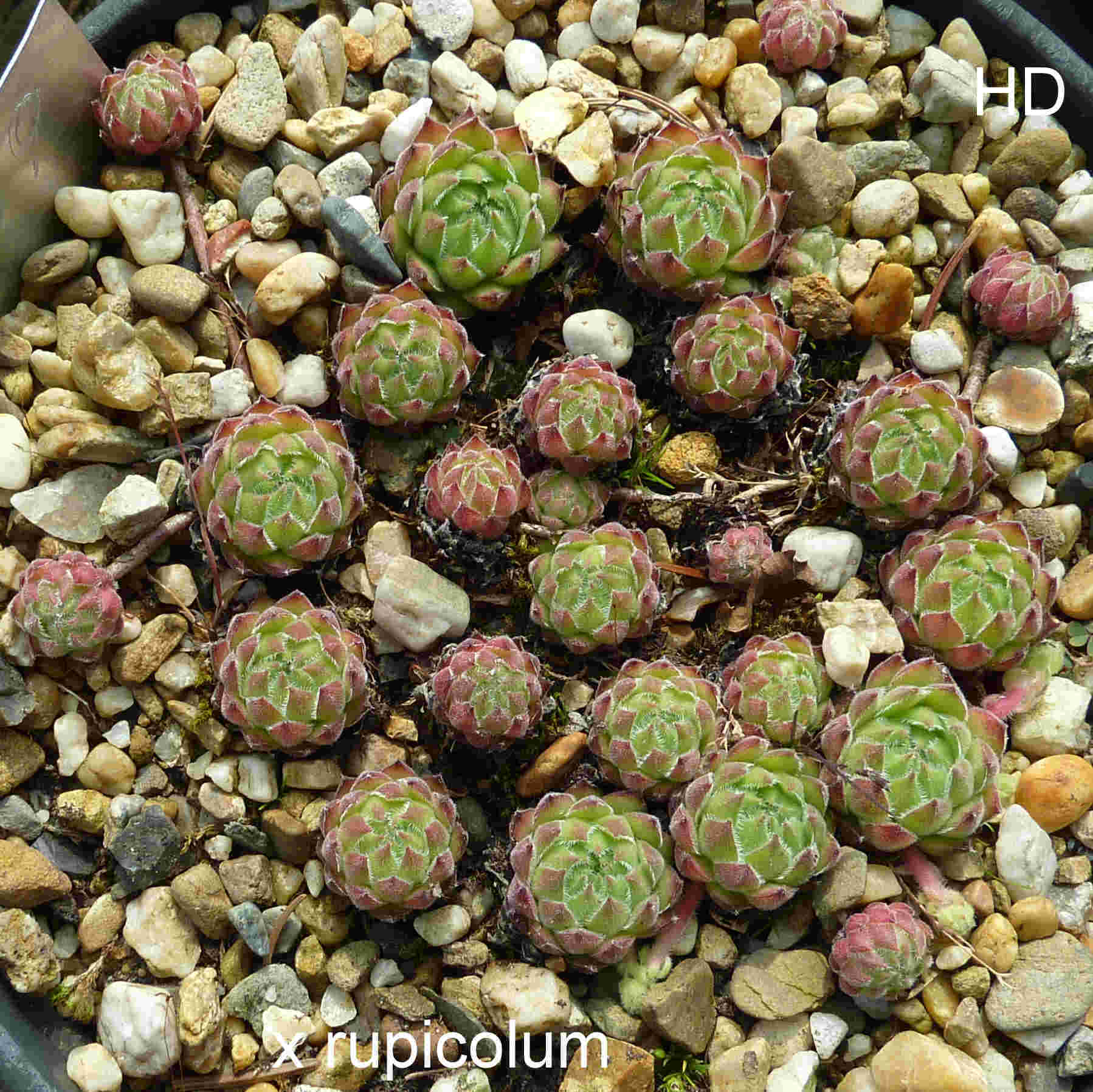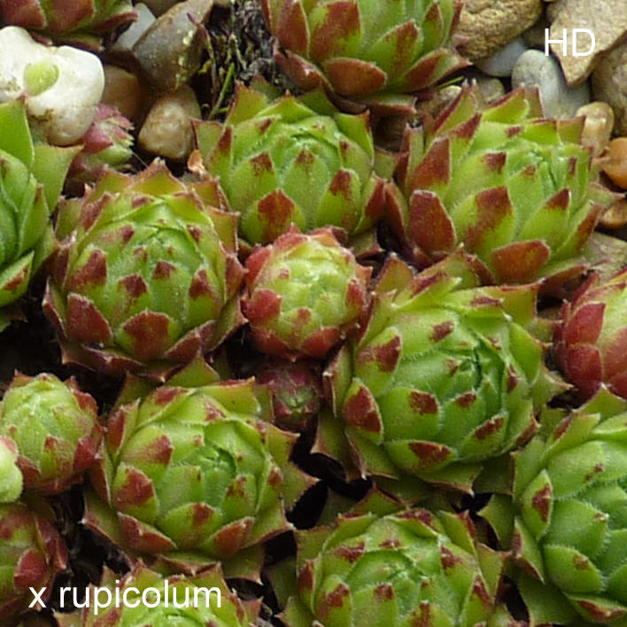 Sempervivum × rupicolum n-ssp. rupicolum = Sempervivum montanum subsp. montanum × Sempervivum wulfenii syn.: Sempervivum ×huteri Haussm. ex Dalla Torre & Sarnth. IK:Sempervivum ×huteri Hausm. ex Dalla Torre & Sarnth., Flora der gefürsteten Grafschaft Tirol, des Landes Vorarlberg und des Fürstenhumes Liechtenstein, 6(2): 435 (1909) huteri = gewidmet dem Botaniker Rupert Huter (* 26. September 1834 in Kals in Osttirol, damals Österreich-Ungarn; † 11. Februar 1919 in Ried bei Sterzing) / Quelle: Wikipedia